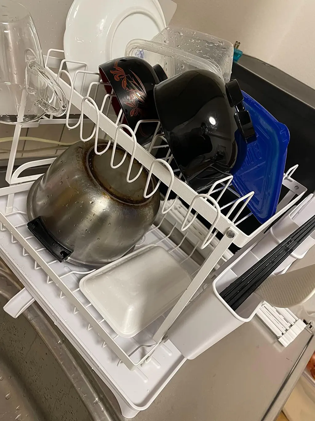 The rack is sturdy and holds a good amount of dishes. I like the side cutlery holder it keeps everything organized after washing.