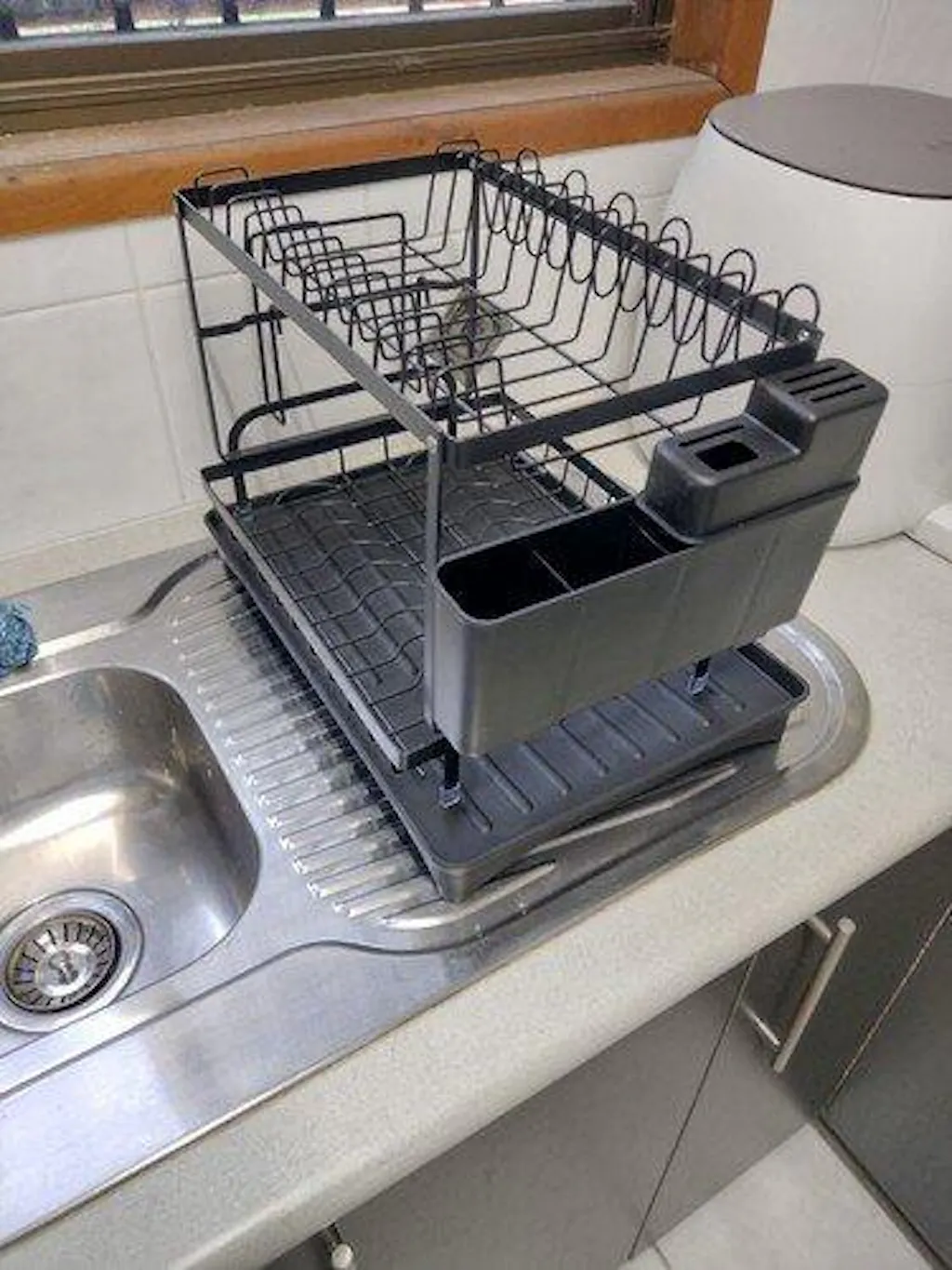 Been using this for a few days and it works really well. Strong enough to hold several dishes and glasses and the water drains properly into the tray.