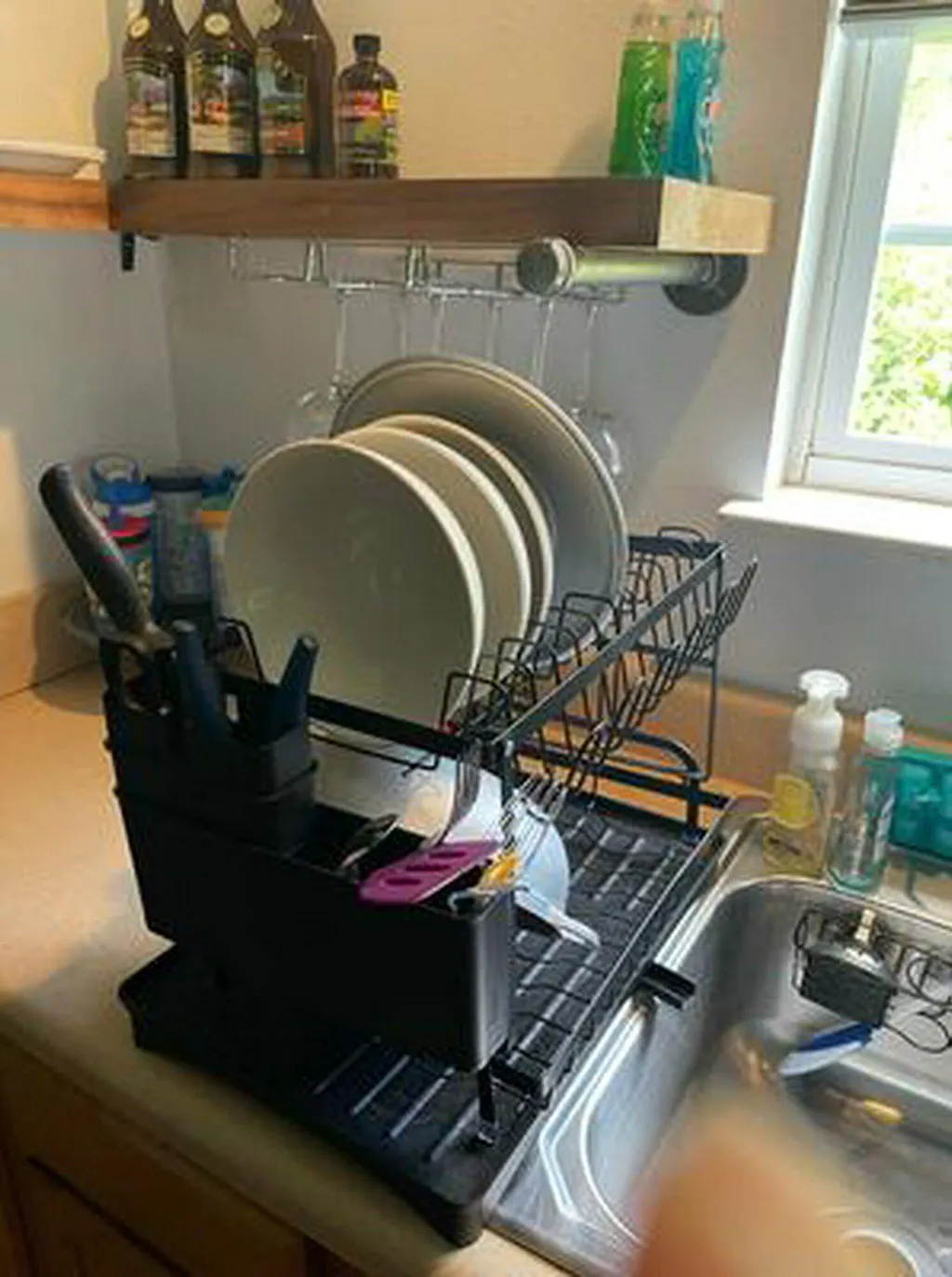 Started using this stylish dish drying rack and it fits perfectly near my sink, and the tray collects the water neatly and keeping my plates and cups organized.